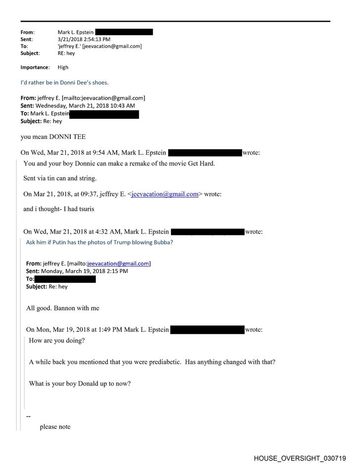 这封关键邮件发生于2018年3月。马克·爱泼斯坦在给弟弟杰弗里的邮件中写道:“问他(指特朗普前顾问班农),普京是否掌握了特朗普为‘布巴’口交的照片?”由于“布巴”是比尔·克林顿广为人知的绰号,这封邮件迅速在网络上引爆热议。