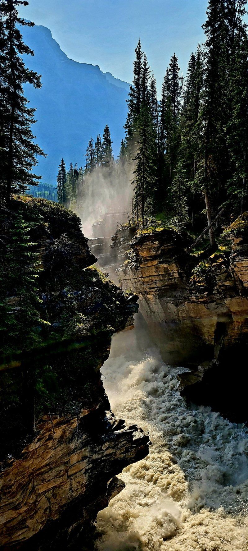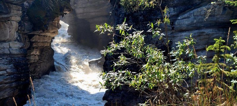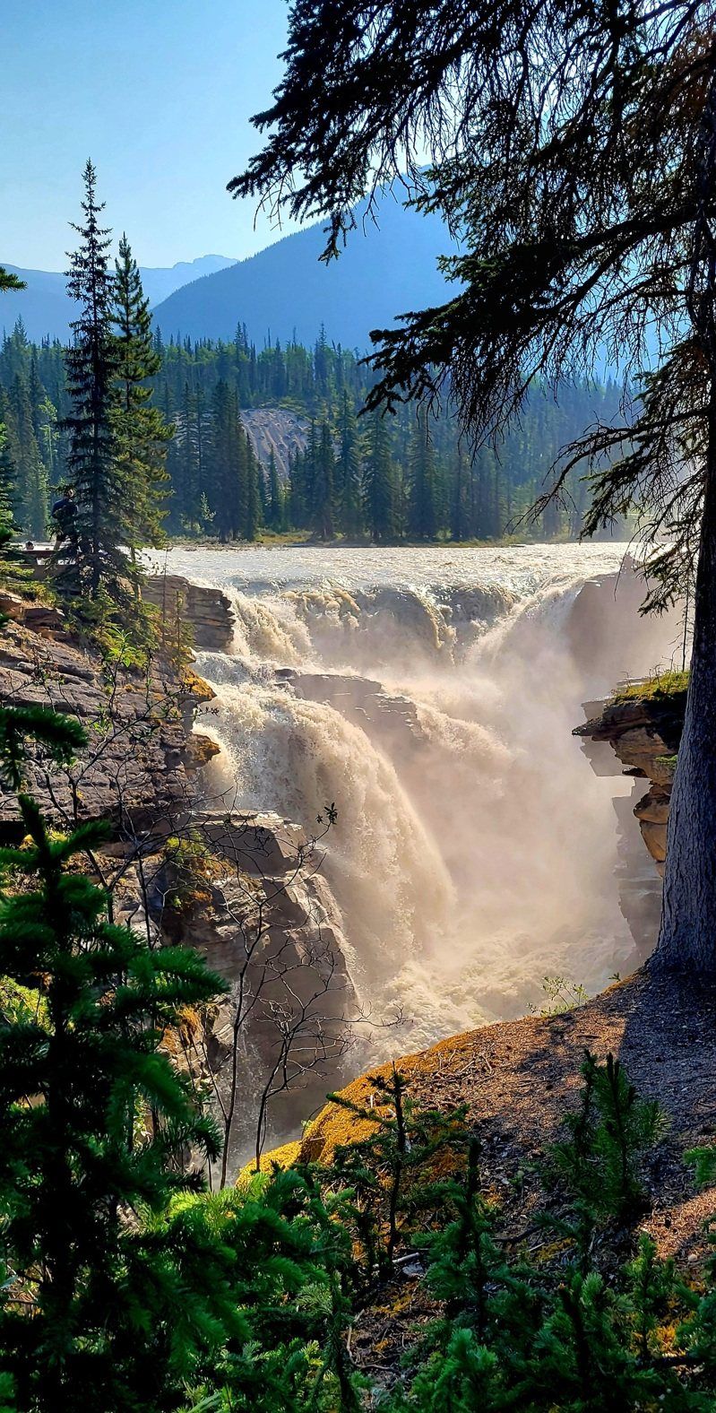 阿萨巴斯卡瀑布湍急的流水从悬崖倾泻而下,气势磅礴。(作者提供)数千年来,瀑布在石英岩和石灰岩中凿出了一条深深的峡谷。阿萨巴斯卡瀑布是阿萨巴斯卡山谷冰川在今天的贾斯珀国家公园内后退时形成的。瀑布落差约23米,从高崖上迅速跌入一个迷人的峡谷,奔腾的河水经过数千年的冲刷,咆哮声恍若千年前令人难以置信。从这里你可以感受到水雾扑面而来,冰川水冰冷清澈,形成令人着迷的碧蓝的色调。阿萨巴斯卡瀑布的独特之处在于其庞大的水量,即使在较为干旱的月份,也会有大量的水流从瀑布中倾泻而下。