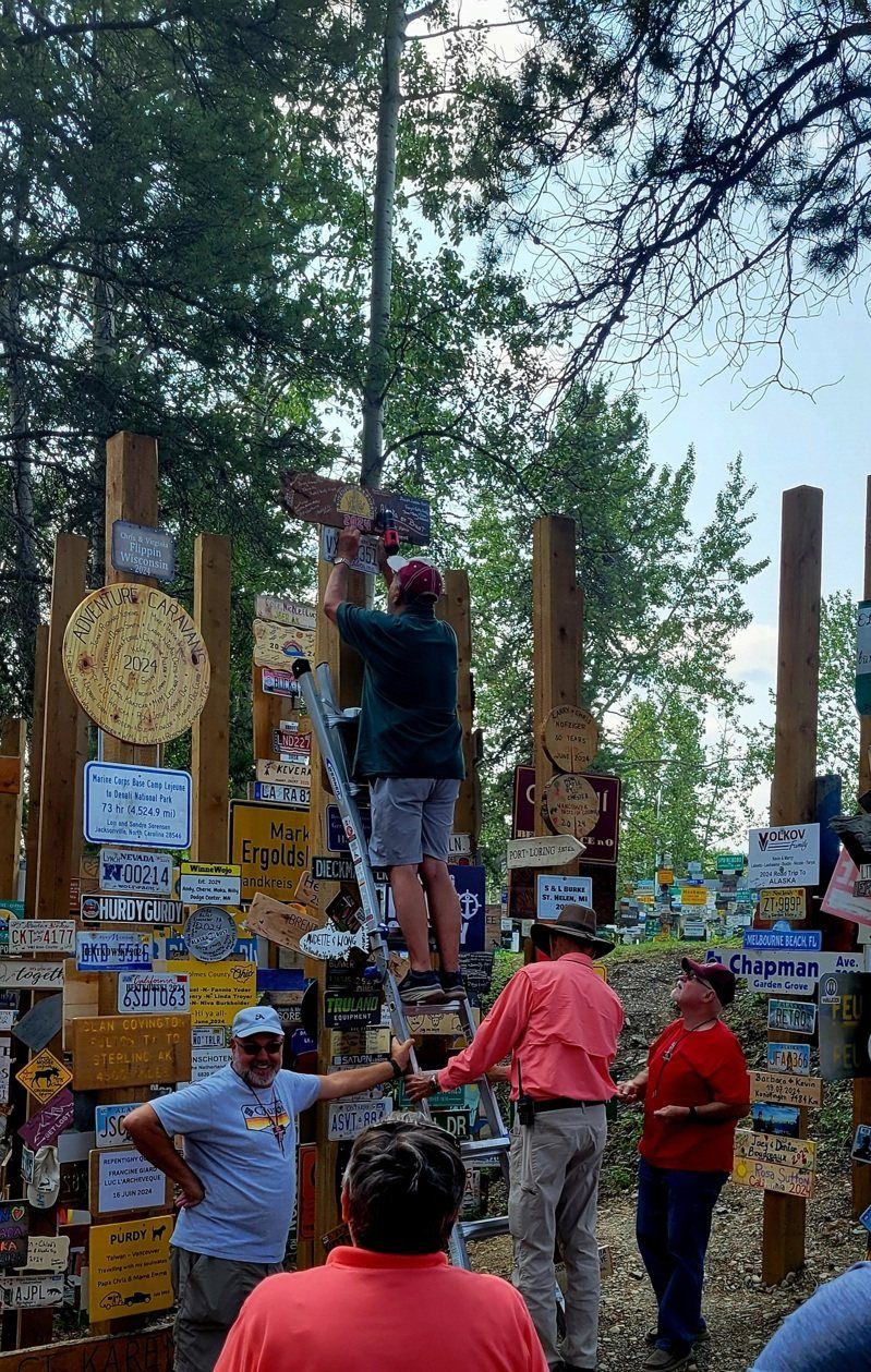 当我来到沃森湖的标志牌森林时,看到那无尽延展的路标,我被深深震撼了。1942年,一位思乡的士兵开始在此建造森林缅怀遥远的故乡。每一个标志牌背后,都是一个故事、一段回忆。从世界各地来的游客在这里留下自己的路标,为这片「森林」增添了色彩。我们的房车车队也准备了一个牌子,用心写下旅程的感悟,将它挂在了一棵树上。那一刻,我感觉到自己成为了这段历史的一部分。