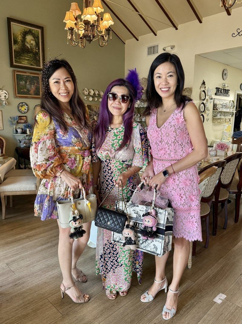 杨安立(右一)最近朋友聚会,每个人包上都挂着一个Labubu。(记者张宏/摄影)