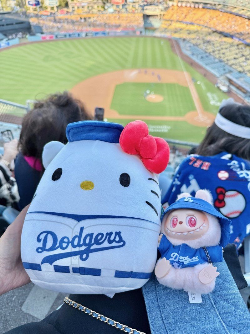 杨安立日前去看道奇比赛带着穿上道奇服饰的Hello Kitty和Labubu。(杨安立提供)