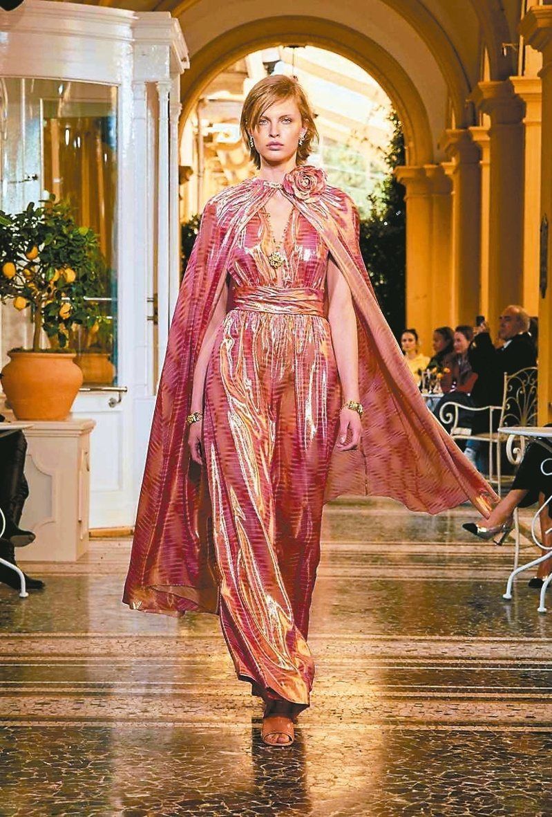 草莓色的光泽感长袍搭配长披风洋溢古典电影明星气息。图/香奈儿提供
