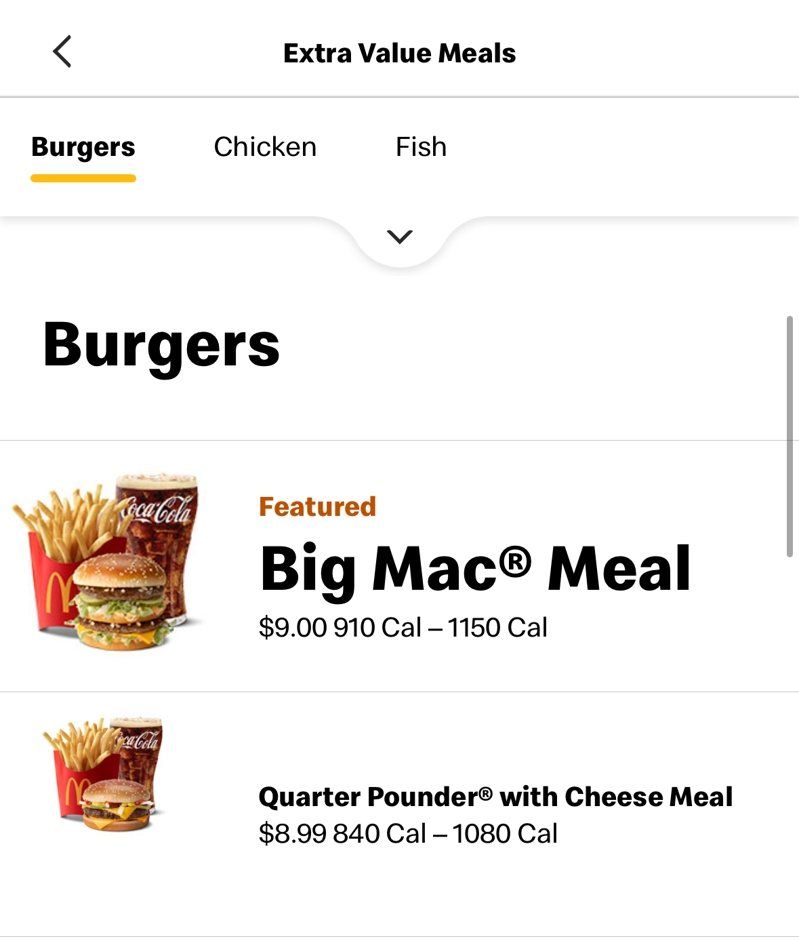 麦当劳「超值套餐」包括多种选择,经典的巨无霸套餐售价仅9美元。(截图自麦当劳APP)