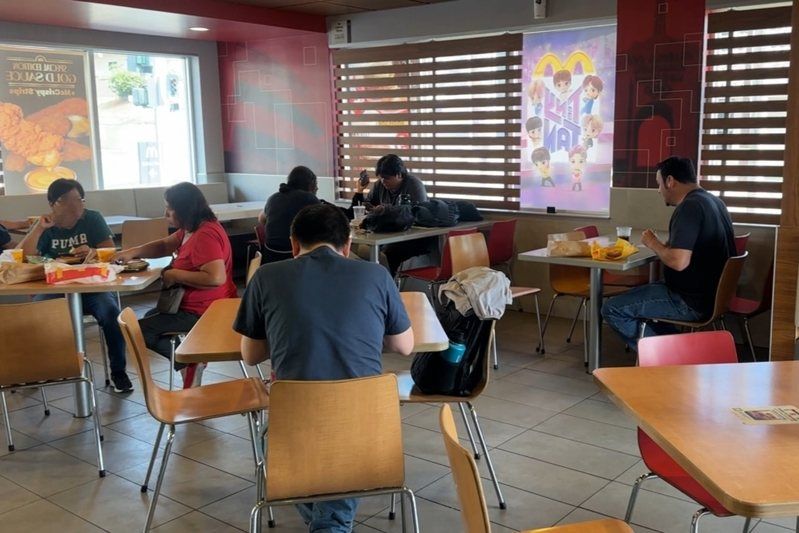 麦当劳近期重推「超值套餐」,比单点餐品优惠15%。工作日白天,蒙市的麦当劳内几乎坐满顾客。(世说新闻团队/摄影)