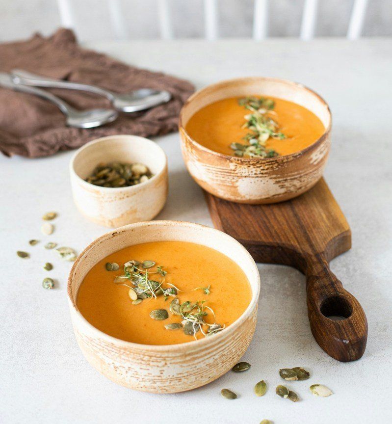 厨师卢克表示若将烤至焦糖化、金黄酥脆的甜辣南瓜籽撒在汤上,甜辣兼具,味道绝佳;南瓜汤示意图。(取材自Unsplash @Mary Potoplyak)