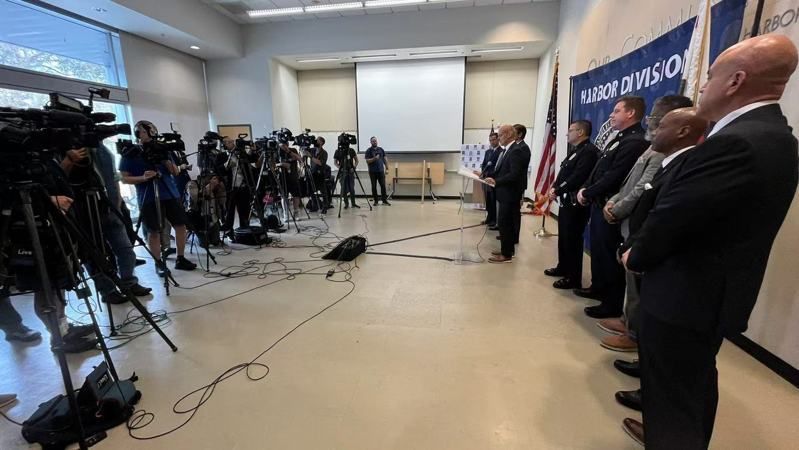 FBI洛杉矶分局助理局长Akil Davis(左二)表示,本次行动将让RSP与墨西哥黑手党遭受重大挫败,并让圣彼渚港区居民重获安全。(李若提供)