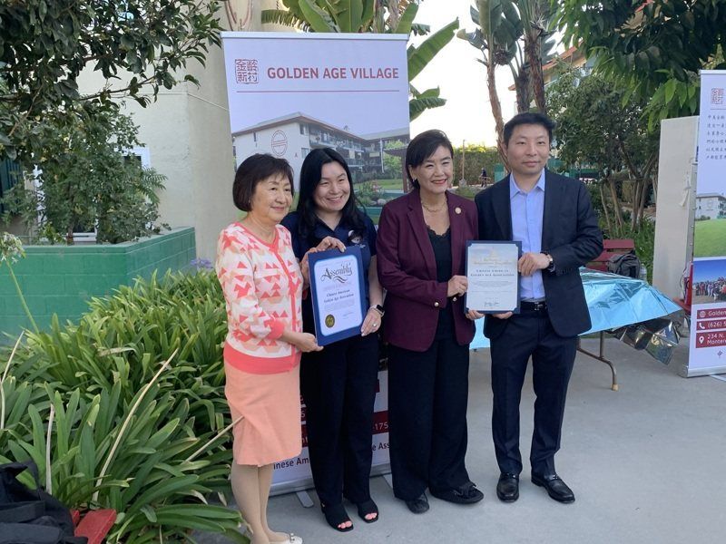 中美金龄会理事长齐铱(左起)、加州众议员方树强的代表、联邦众议员赵美心和中美金龄会理事李凌霄。(记者张宏/摄影)