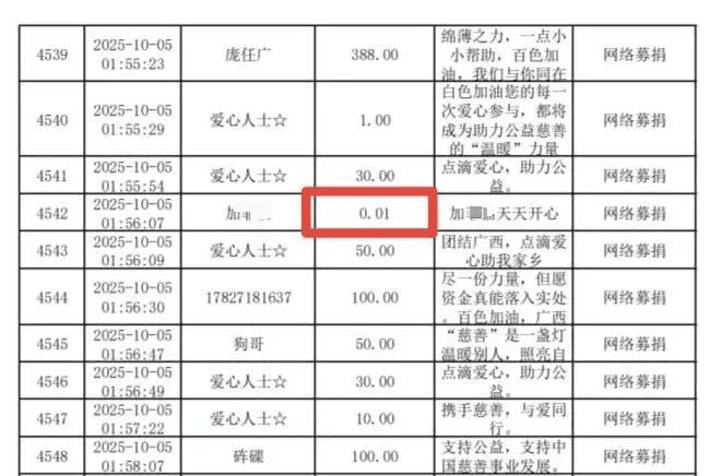 据极目新闻,10月6日晚,百色市慈善总会在其官方公众号发布了「接收「洪灾救助」社会捐赠公示(第一期)」称,10月2日0时至10月5日24时,百色市慈善总会接收洪灾救助社会捐赠资金7542笔,共计1825796.83元,另有2万元物资。爱心人士捐赠金额较为悬殊,有的高达10万元,有的只有1元,甚至有好几笔捐款金额是0.01元。