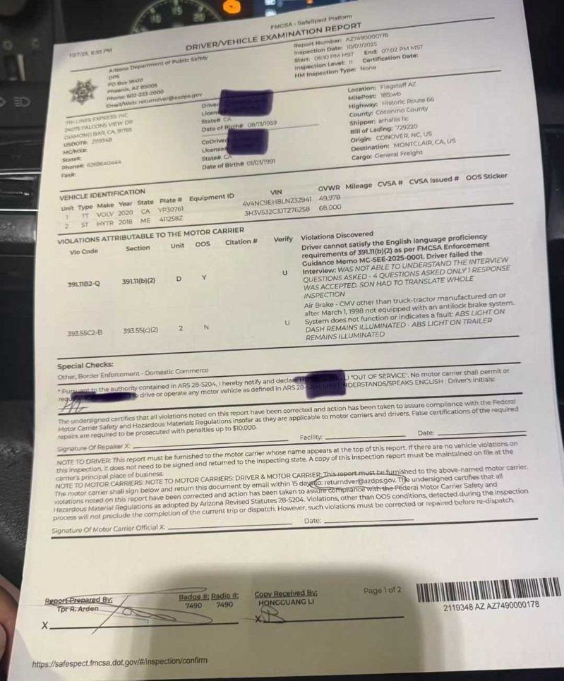 北美卡车运输协会表示,近日一名66岁的华人卡车司机和一名34岁的华人副驾驶,从北卡运货前往南加的蒙克莱(Montclair),他们途径亚利桑那时被临时拦检。两人均持加州卡车驾驶执照,但执法者在罚单上写吊销执照的理由,是驾驶人英文不符合联邦卡车司机安全委员会的要求,驾驶人无法理解面试的问题,「四个问题中,只有一个的答案可以接受。」整个卡车安检过程,都需要翻译帮忙。