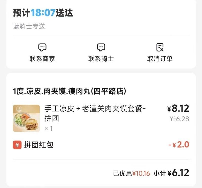 让Jenny印象深刻的是,回中国期间,「饿了吗」平台推出爆品团,每款套餐价格几乎都在10元人民币以内;换句话说,一美元就可以吃丰盛的正餐。彭博社(Bloomberg)等外媒报导也指出,中国外卖平台通过补贴和折扣,将餐价压至「50美分一餐」(约3.5元人民币),一杯咖啡甚至低至1美元。张女士提供的上海外卖单显示,一份手工凉皮加上肉夹馍,总价8.12元人民币,拼团红包再减2元,到手价共6.12元人民币(约0.85美元)。