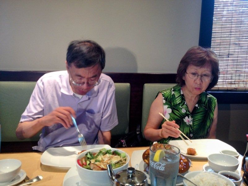 陈戴维(左)和太太在斯普林菲尔德的一家餐厅品尝腰果鸡丁。(陈戴维提供)