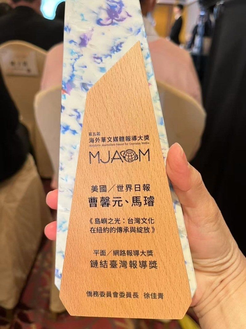 而纽约社记者曹馨元与马璇的作品「岛屿之光:台湾文化在纽约的传承与绽放」则是获得平面/网路媒体类的「链结台湾报导奖」。该系列报导台湾同志社群在美茁壮历程,采访纽约市首家亚裔同志酒吧「盘丝洞」创办人周龙章,以及纽约骄傲月游行台湾队总召李浩祥跨世代的连结;亦参与游行全程并采访三位从台湾前来参与的变装皇后跩姬宝贝、蔷薇与汉娜,记录他们前进纽约的文化实践;该系列同收录台湾原创音乐剧「劝世三姐妹」首登纽约外百老汇的专访文章,展现台湾精神在纽约的里程碑。