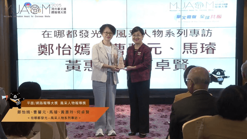其中,世界日报纽约社以「在哪都发光—风采人物系列专访」夺得平面/网路媒体类「风采人物报导奖」。该系列由纽约社记者郑怡嫣专访作家王鼎钧,谈及颠沛人生、写作喜好及对故乡与纽约的情感连结;纽约社记者何卓贤采访汉学家孙康宜,分享她从白色恐怖到退休整理人生与父亲遗作的历程;芝加哥特派员黄惠玲报导芝加哥大学助理教授徐伯均,回顾其从建中到清大的学思历程,揭示所谓「学霸」之路的努力与坚持;纽约社记者曹馨元与马璇则是拜访百年杂志「纽约客」办公室,并采访数位版执行主编罗明瀚撰写新书「异乡之人:华裔美国人百年间的挣扎与归属」幕后故事,呈现其透过家族、个人经验与历史资料探讨华人在美身分认同的追求。