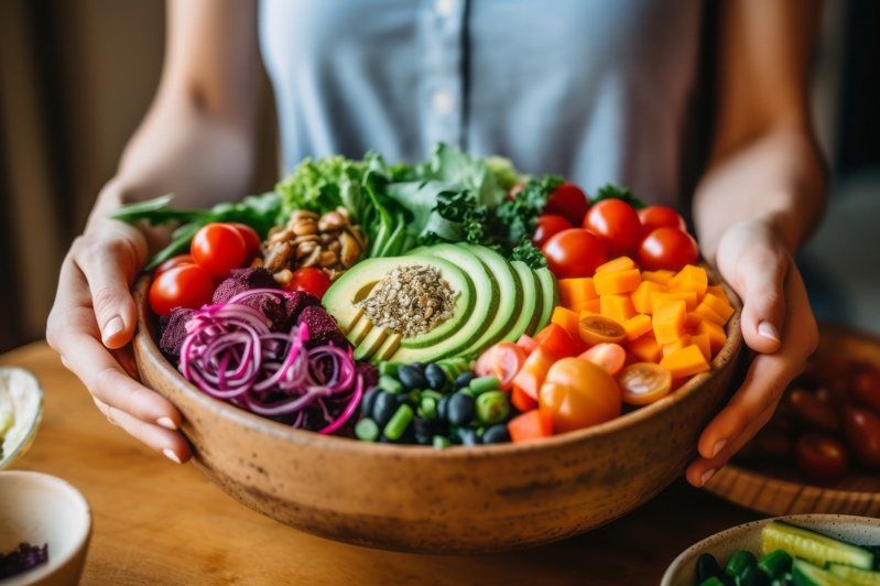 美国长寿专家费芮主张,进食顺序可能影响身体健康甚至老化状况,她建议先吃蔬菜并以多样色彩的原型食材为主,再吃蛋白质,最后才吃碳水化和物;示意图。(图/123RF)