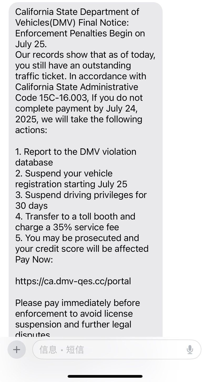 Jack说,平常时不时能看到媒体报导提醒,希望大家注意骗局,自己也没当回事,没想到,下半年收到的短信和电话诈骗开始增加。最常见的是说自己欠下某地的过桥费或交通罚单,逾期未交费,会遭遇吊销驾照等。Jack七月收到一条短信,他仍有未缴交通罚单,若未能在7月24日前完成支付,将从7月25日起执行处罚。包括向车管局(DMV)违规资料库上报,自7月25日起暂停车辆注册,吊销驾驶资格30天,转交收费站处理并加收35%服务费,可能面临起诉且信用评分受损。
