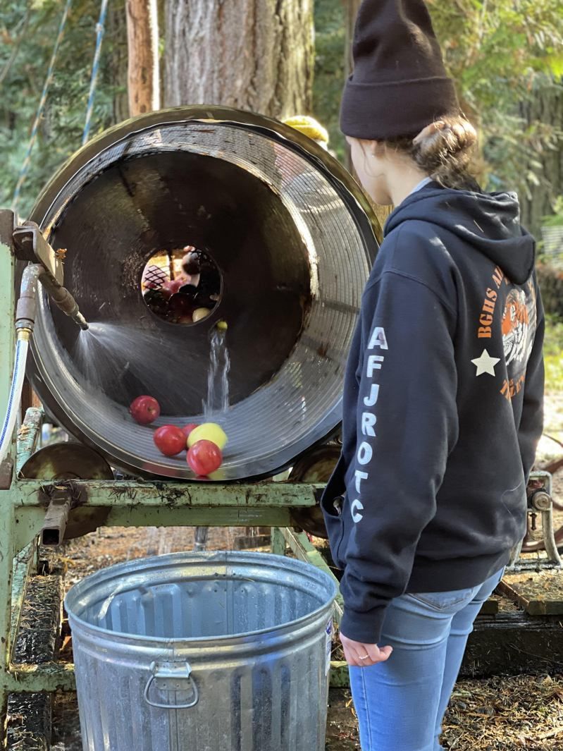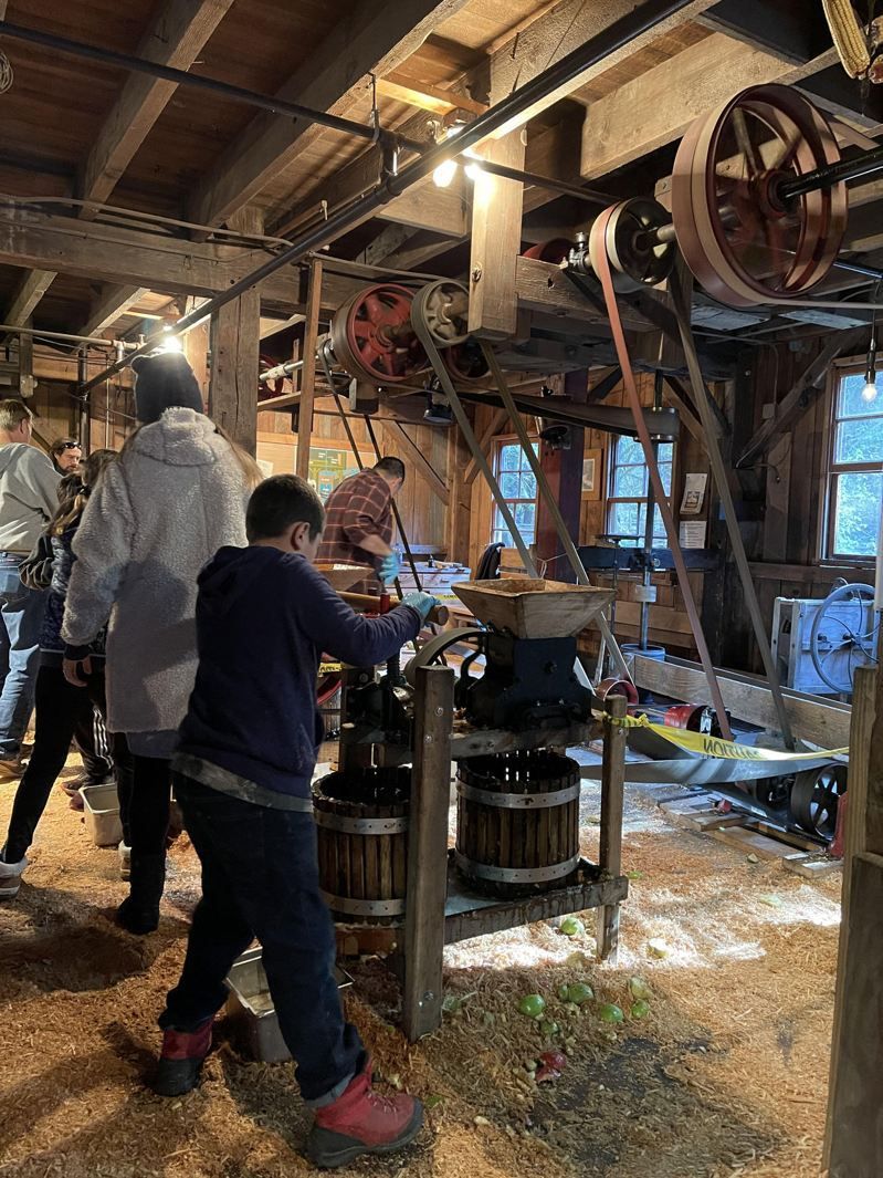 抵达磨坊时,正好看见工作人员忙着清洗苹果。来自邻近果园的苹果,连续不段地被放进巨大的转动卷筒内清洗。接着,一桶又一桶地被运送到磨坊里面。在磨坊内有另一组人员,他们将切块的苹果放进一个特大号的压榨机器。一名工作人员以一根木棍推动旋钮,以压缩苹果。接着,可见略呈金黄色的苹果汁,泉流而出。
