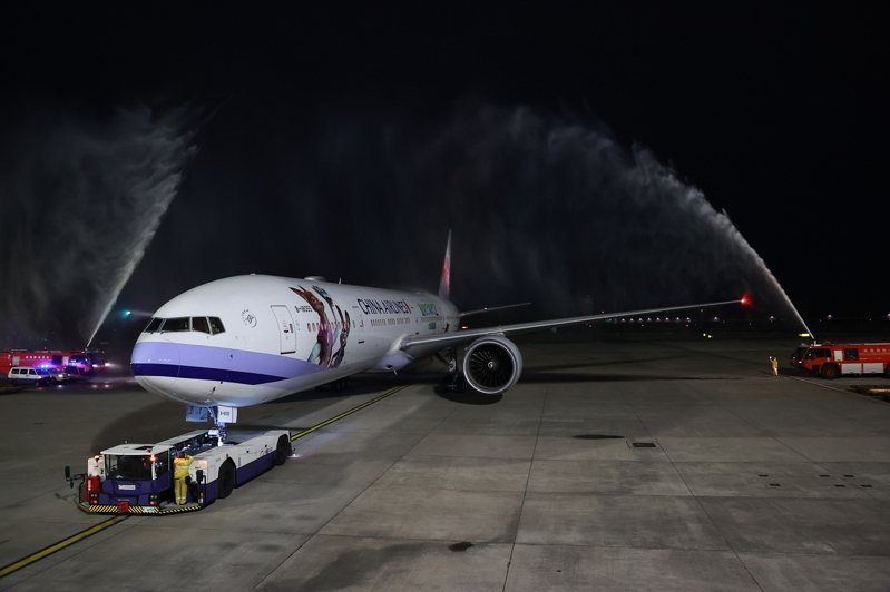 中华航空「动物方城市2主题彩绘机」首航台北-洛杉矶,机场公司安排水门礼,庆祝全台第一架迪士尼彩绘机启航。(记者黄仲明/摄影)
