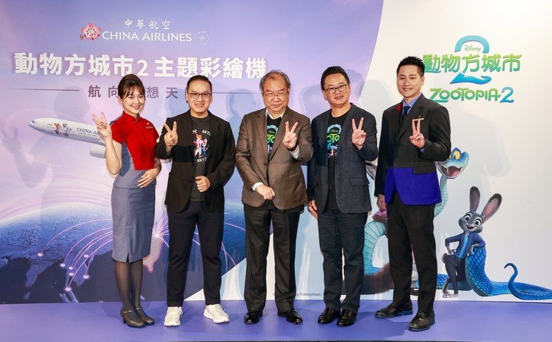 中华航空「动物方城市2主题彩绘机」首航台北-洛杉矶,华航董事长高星潢(右三)、总经理陈汉铭(右2)与华特迪士尼公司亚太区影业发行及营运负责人徐隆立(左2)共同出席首航仪式。(记者黄仲明/摄影)