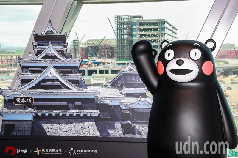 日本因台积电前往熊本建厂,加上台人对日韩文化亲近性,台人赴日工作增幅17.5%最大。图为桃园机场日本展区设置熊本当地最富盛名熊本城造景。(记者黄仲明/摄影)