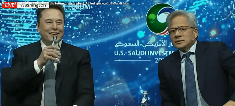 特斯拉执行长马斯克(左)和Nvidia执行长黄仁勋,在华府举行的「美国-沙乌地投资论坛」上对谈。(截图自YouTube)