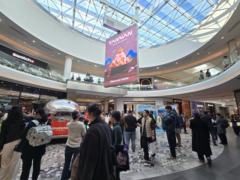 活动现场人潮踊跃,连同正上方的广告看板也接连拨放台湾观光特色。(记者孙爱薇/摄影)快闪活动设计丰富,将台湾景点浓缩在3D立体视觉拍照墙与民众互动,一组为从象山俯视台北101的「视觉错位趣味合照」,只要将照片上下翻转就如同在象山倒立的纪念照,有趣的临场拍摄效果,吸引众多年轻与亲子族群排队拍照纪念。