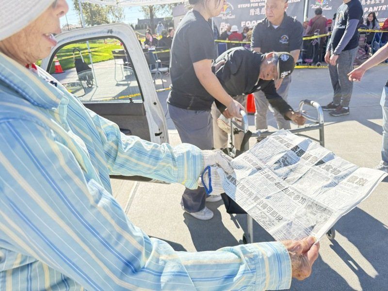 陪同沈先生前来的朋友,是一名年长女士,她拿出一张世界日报,指着其中一篇报导说,近日看到新闻,才知道这里可以领取免费食物。该女士希望义工给沈先生一份食物,也请求可以给她一袋。