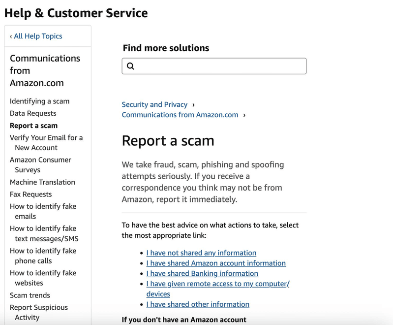 用户也可向联邦贸易委员会(Federal Trade Commission,FTC)回报可疑电话或简讯https://reportfraud.ftc.gov。也可上https://www.amazon.com/gp/help/customer/display.html/?nodeId=201127790。
