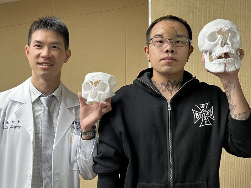 三军总医院整形外科主治医师徐国峰(左)表示,3D列印导入颅颜重建,可精准重塑骨骼结构。(记者廖静清/摄影)