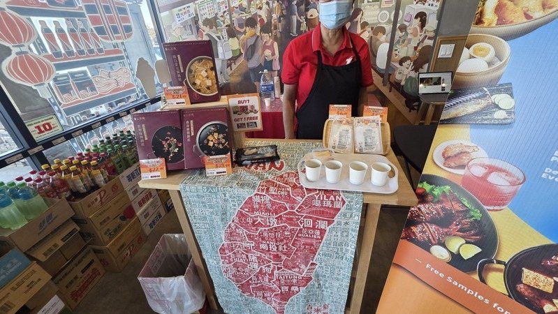 iTaiwan Foods门市摆设「养心茶楼」冷冻锅底与火锅料展示台,现场提供免费试喝,吸引不少顾客停留了解与选购。(记者张庭瑜/摄影)