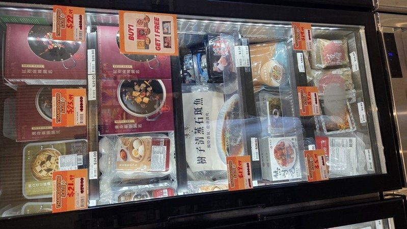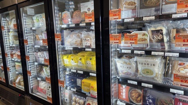 活动期间,iTaiwan Foods冷冻柜内贴出大幅折扣标签,包含热炒、卤味、汤品等台湾家庭料理应有尽有。(记者张庭瑜/摄影)