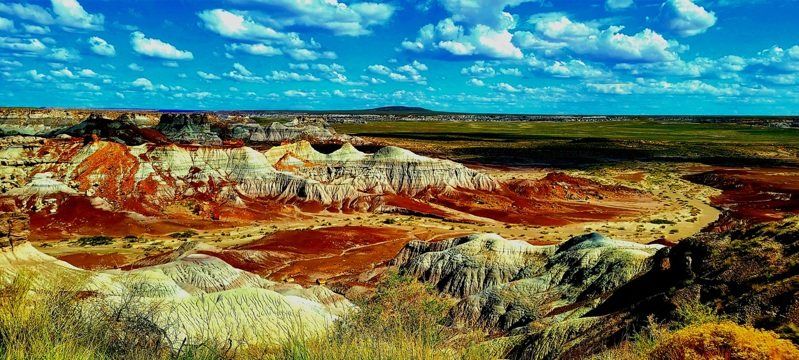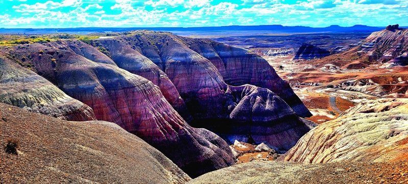 进入园区不久,彩绘沙漠(Painted Desert)便展现出令人难以置信的色彩层序。粉红、赭红、紫蓝、淡灰等色带沿着丘陵起伏,绵延至天际。远观如大片水彩,近看则是层层沉积岩写下的千万年笔迹。