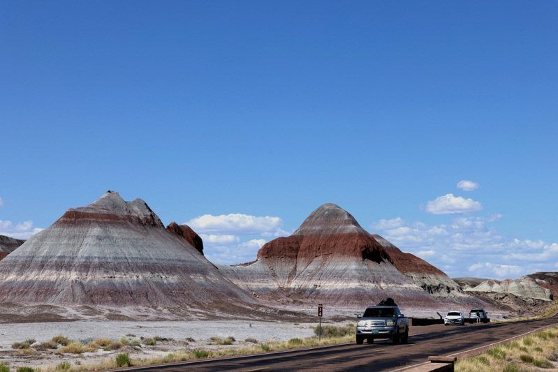 石化森林国家公园中,一辆车行经公园里的彩绘沙漠公园间。(路透)