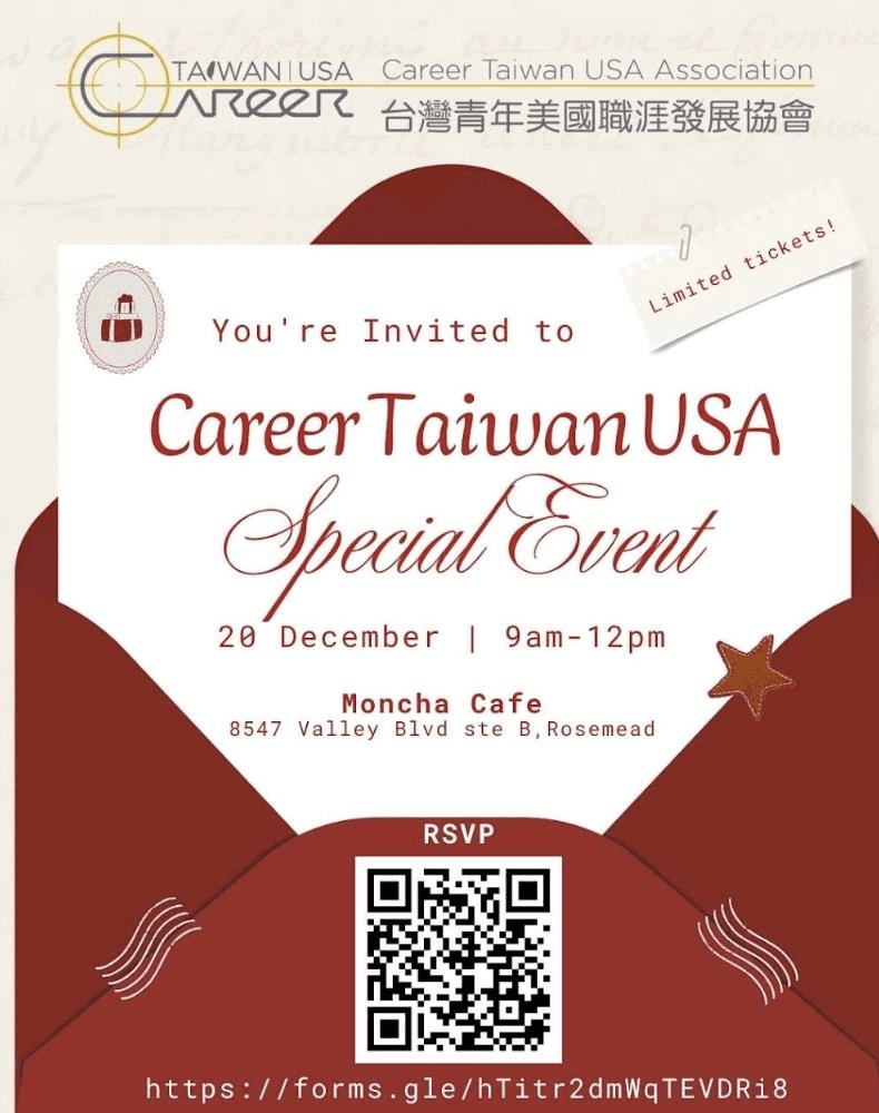 洛杉矶的台湾青年美国职涯发展协会 (Career Taiwan USA) 将于12月20日举办十周年庆活动,邀请各界领袖、合作夥伴及关心青年职涯发展的朋友共襄盛举。活动将回顾组织过去十年的发展历程,并规划未来十年策略蓝图。