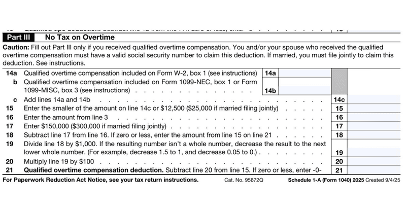 Lawrence Pon指出,无论你以前是采用标准扣除还是逐项列举,都能申请这项扣除。可扣除的部分指的是加班工资中、超过你原本时薪的那一段,也就是常说的「一倍半加班费」里的「多出的一半」。和小费扣除相同,必须是已在W-2、1099或其他指定表格申报的加班收入,才符合资格。