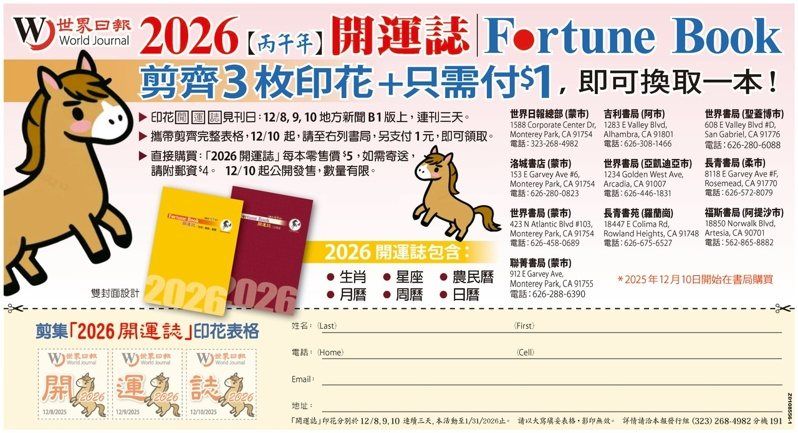 世界日报2026年开运志(Fortune Book)12月10日起,在各大书局出售。开运志双封面设计,包含农民历、日历、月历、周历、生肖和星座。8日起剪集三枚印花,即可换购开运志。