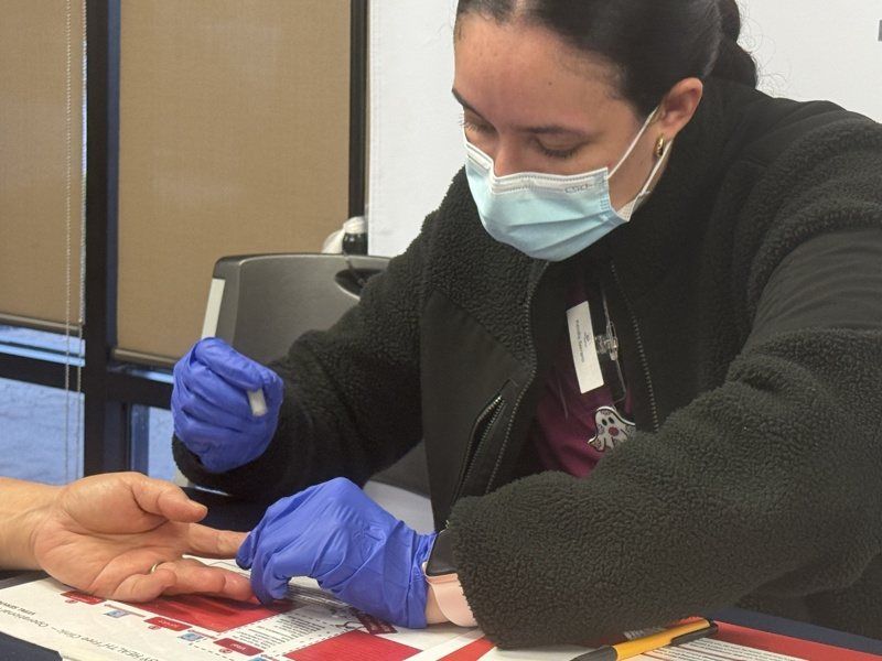 华女突然吐血,义诊确认为癌症晚期。示意图为医护人员帮助病患测血。(记者邵敏/摄影)