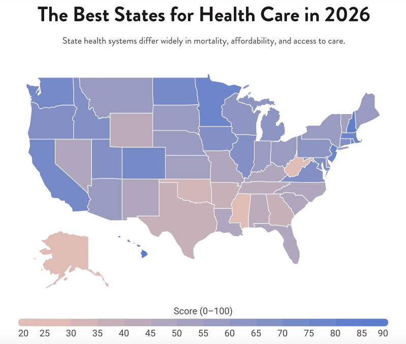 MoneyGeek这份研究报告针对美国50州及哥伦比亚特区的医疗系统进行评估,涵盖14项指标,包括健康结果、医疗费用以及医疗可及性。这份2026年各州医疗排名可帮助民众了解,哪些州的医疗系统表现优异?哪些州则相对落后?