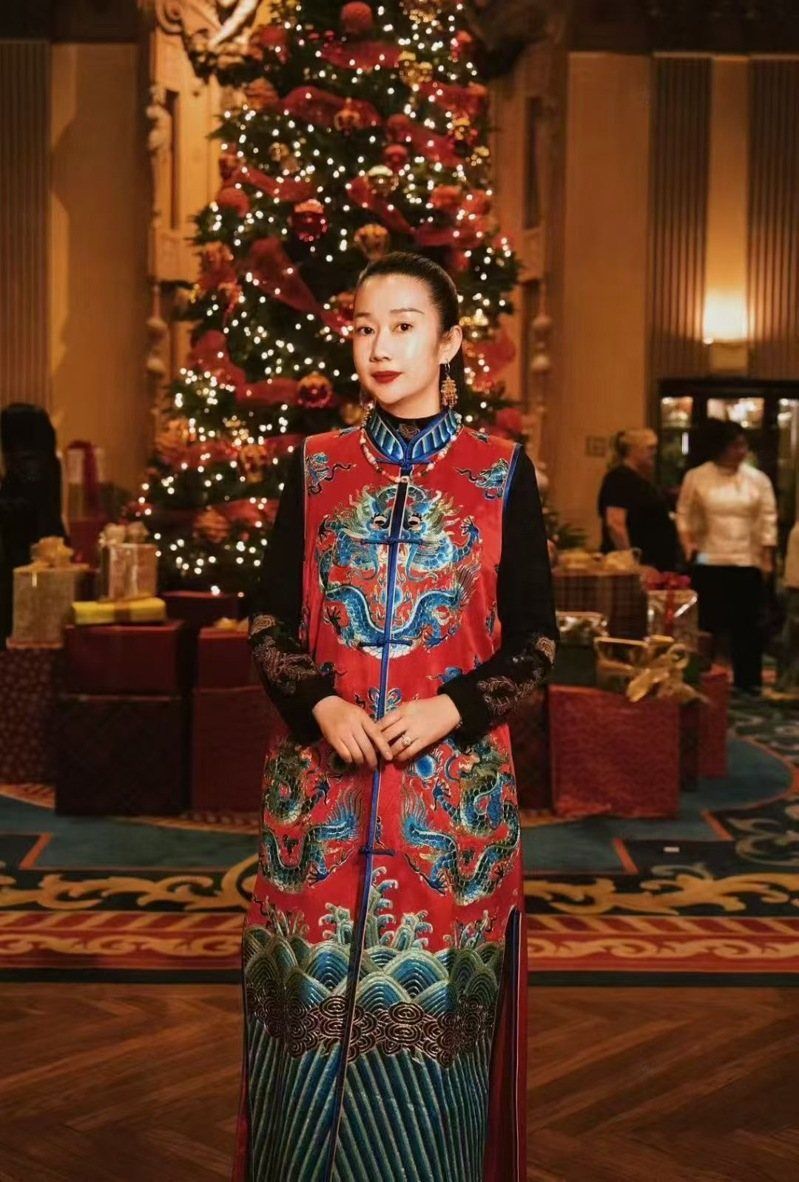 张子淇日前在一次活动上身穿绣着海水江崖图案的龙纹外套。(张子淇提供)