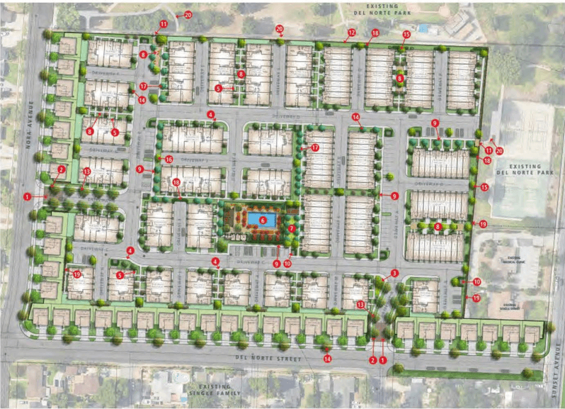 根据西科汶那市城市规画委员会发布的初步建案报告,这处建案位于1501 Del Norte大街,需要将目前土地上的建筑销毁。该建案包含34栋独立屋,248座连栋屋及叠层屋(stacked flats),共282户住宅。总建案占地13.56公亩。