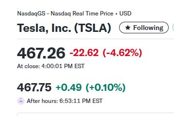 特斯拉股价应声下挫4.62%。 (finance.yahoo.com截图)
