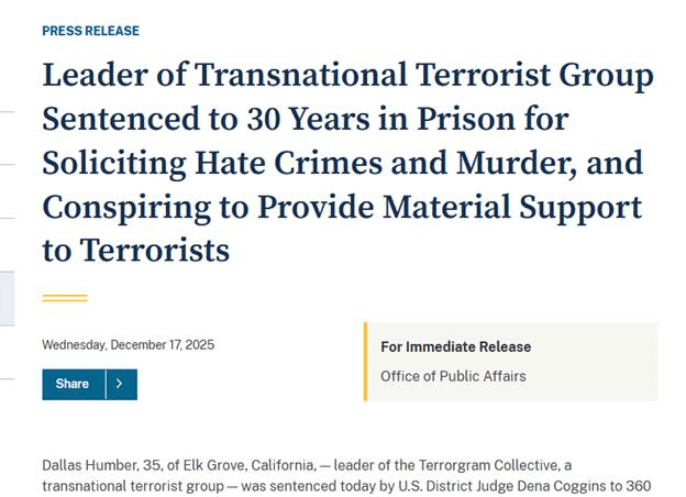 「今天的30年刑期传递了一个明确的信息」,司法部助理部长迪伦(Harmeet K. Dhillon)在公告中说道,「如果你策画恐怖袭击或利用极端主义网路煽动暴力,你终将被绳之以法,并被判处数十年监禁。」