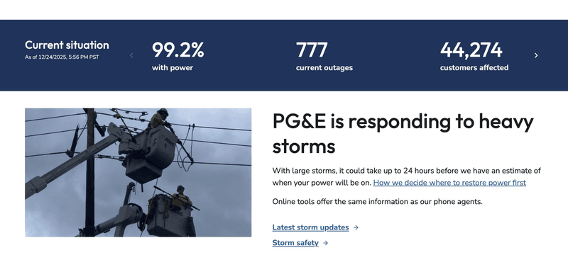 此次停电事件,发生在北加州与中加州接连遭遇强烈冬季风暴之际。PG&E说明,两波冬季风暴带来豪雨与强风,对多个县市电力系统造成冲击。截至周三中午,全州仍约有7万5000名用户停电,但公司已成功为超过13万4000名受影响用户恢复供电,其中89%的复电作业在停电后6小时内完成。