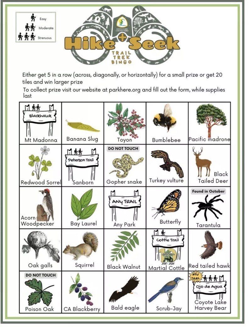 「Hike and Seek」活动以 Bingo(宾果)游戏 形式进行,参加者可选择下载、截图或列印健行宾果卡,依据卡片上的项目拍照纪录自己在县立公园里所见的动植物或自然景观,横、直或斜线完成五格即可获得小奖品;完成 25项中任意20项 则可换取纪念头巾(bandana)。若能完成整张宾果卡的 「全满黑out」 纪录,更可进入抽奖名单,有机会赢得圣塔克拉拉县公园的停车证。