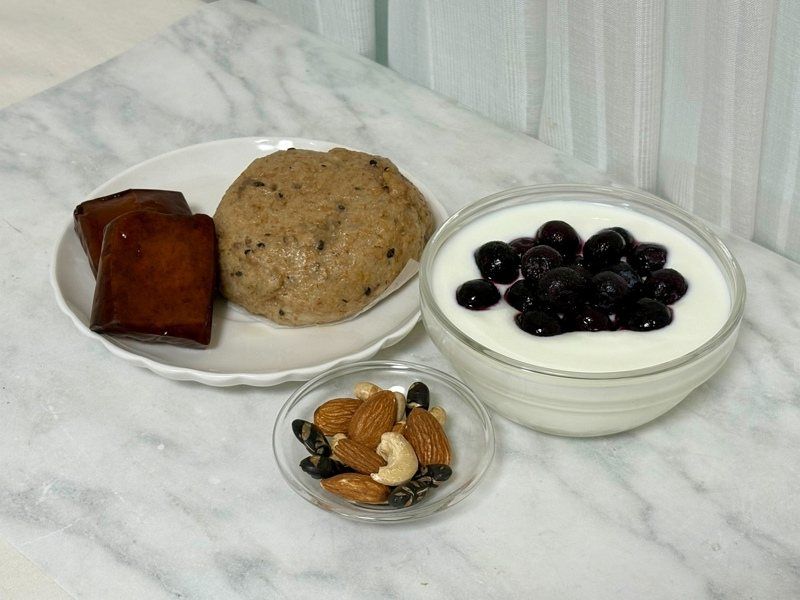 台湾林口长庚纪念医院临床营养师黄湘的早餐:杂粮馒头+豆干+无糖优格+蓝莓+坚果。 (图/黄湘提供)