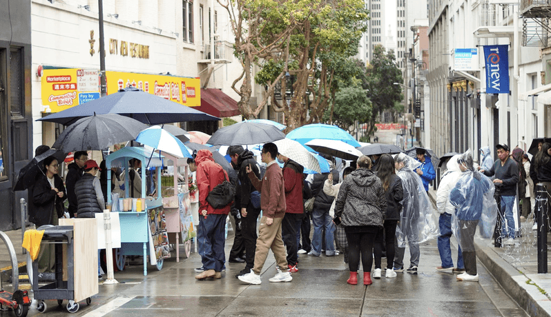 尽管一波降雨于除夕当天影响湾区天气,「华埠商遇里」作为试点性质的小型市集,仍吸引不少民众前来参与。现场以年轻族群居多。多辆装饰精美的美食小推车沿街排开,贩售奶茶、糖葫芦、龙须糖与鲜花等商品,撑着五颜六色雨伞的民众穿梭其间,为雨中的华埠街头增添热闹景象。
