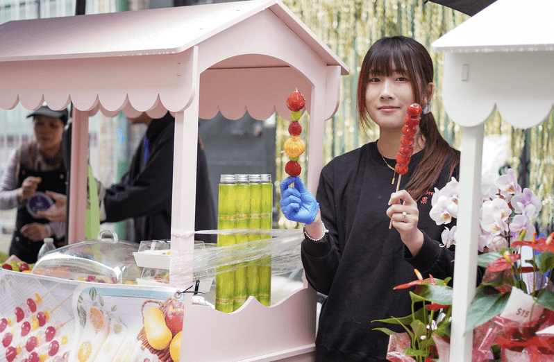 装饰精美的美食小推车售卖包括奶茶、糖葫芦、龙须糖、鲜花等。食客们五颜六色的伞,充满了华埠的大街小巷。(记者王子涵/摄影)