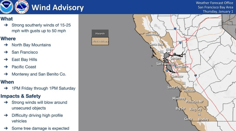 该项强风警报自周五下午1时起,至周六下午1时止。气象局表示,南风影响范围包括旧金山、东湾丘陵、北湾山区与沿岸地区,涵盖雷耶斯岬国家海岸、半岛沿岸、马林丘陵、西索诺玛县丘陵以及圣克鲁兹山脉。