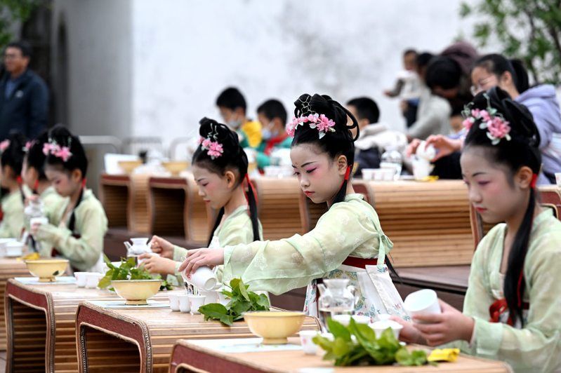 福州小学生体验茉莉花茶盖碗泡法技艺。 (中新社)