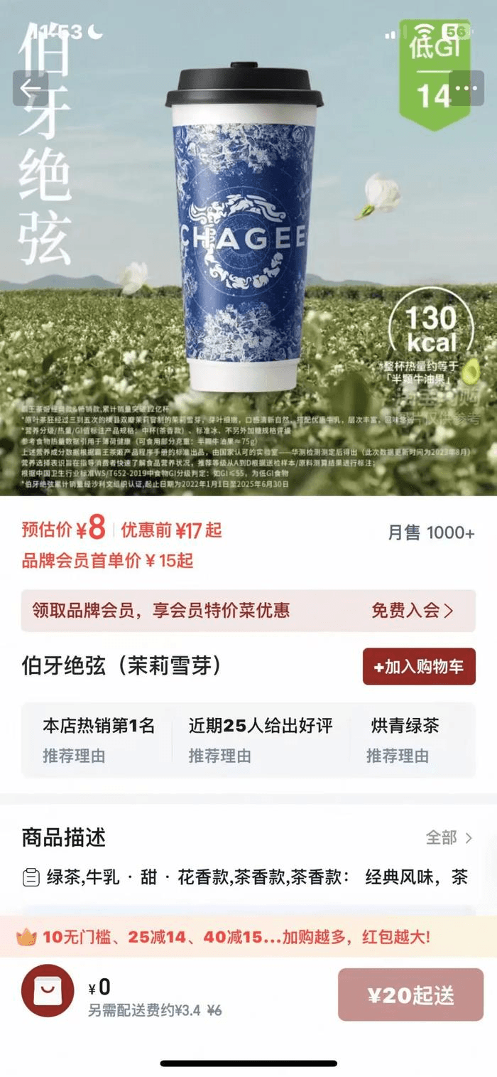 这并非霸王茶姬第一次因咖啡因陷入争议。2024年5月,有多名网友称喝了霸王茶姬「万里木兰」奶茶后出现心慌心悸等不适症状,有人还「喝进医院」。为适应消费者需求,霸王茶姬2025年3月与5月分别推出了伯牙绝弦、花田乌龙等招牌产品的低因款,称相较于常规款,一杯大杯、标准冰、标准糖的轻因·伯牙绝弦,咖啡因含量下降了约50%,并在小程序上提示「原叶真茶,茶叶本身含有咖啡因,请茶友根据自身情况合理把握饮用时间」。