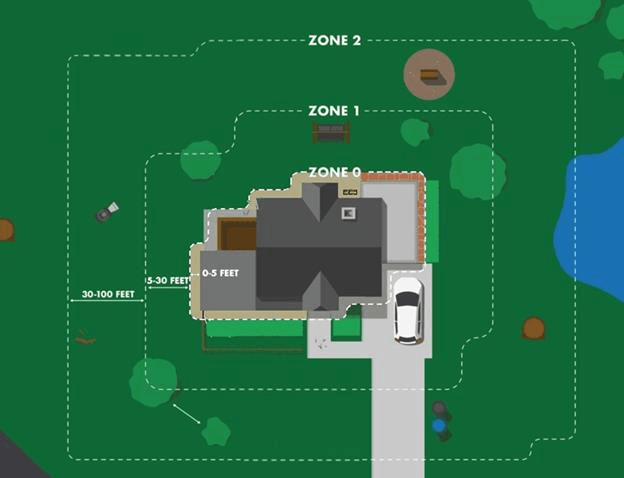 加州林业和消防委员会把房屋周围的防火带分为0、1、2三个区。 (取自bof.fire.ca.gov)
